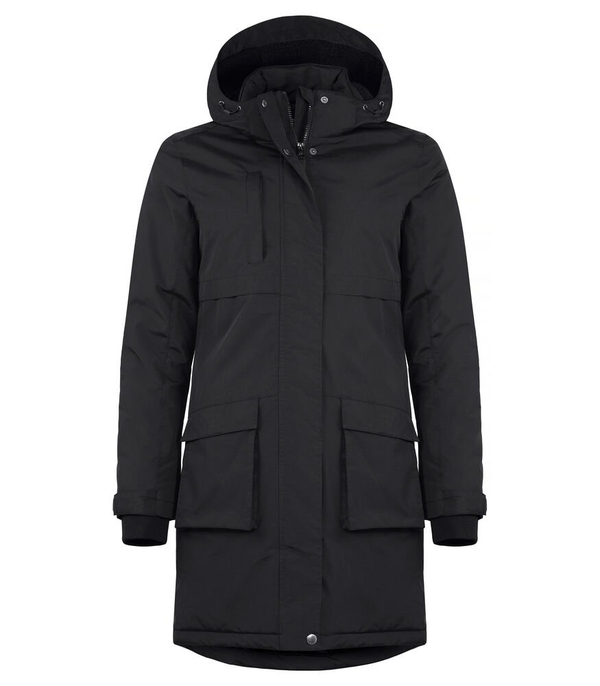 Een gewatteerde damesparka die bescherming biedt tegen wind en water. De parka is afgewerkt met een afneembare en verstelbare capuchon gevoerd met een zachte teddystof, een gewatteerde binnenkant en een trekkoord in de taille en zoom. De borstzak met ritssluiting, twee voorzakken met een magneetsluiting, twee binnenzakken met rits en twee mesh binnenzakken bieden voldoende opbergruimte. De manchetten zijn verstelbaar met klittenband en hebben een 2×2 rib in de mouw. De parka heeft een doorvoer voor een koptelefoon en is dankzij de borduurrits eenvoudig te veredelen. De stijl van deze parka sluit perfect aan bij de Creston of de Eskie.