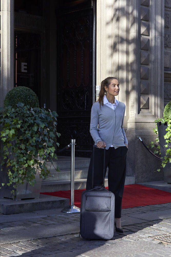 De perfecte trolley voor uw reizen, geschikt als handbagage. Deze stijlvol ontworpen trolley heeft een afsluitbaar, gevoerd hoofdcompartiment met SBS-rits. Banden houden uw spullen op z’n plaats terwijl u onderweg bent. Aan de binnenzijde heeft de trolly een met rits afsluitbaar groot vak. Aan de buitenzijde een royaal vak met rits aan de voorkant voor snelle toegang. De twee wielen maken de trolly licht en wendbaar. De telescopische handgreep kan ter bescherming worden opgeborgen in een afsluitbaar compartiment. De bovenkant, onderkant en zijkanten zijn PU-gecoat voor extra stevigheid. Wordt geleverd met een stijlvolle, met stof gevoerd handvat. Wanneer deze niet wordt gebruikt, kan deze worden samengevouwen om opslagruimte te besparen. Gewicht 1,8 kg. Afmetingen en volume inclusief wielen en handvat: 35x54x19cm ≈ 32L