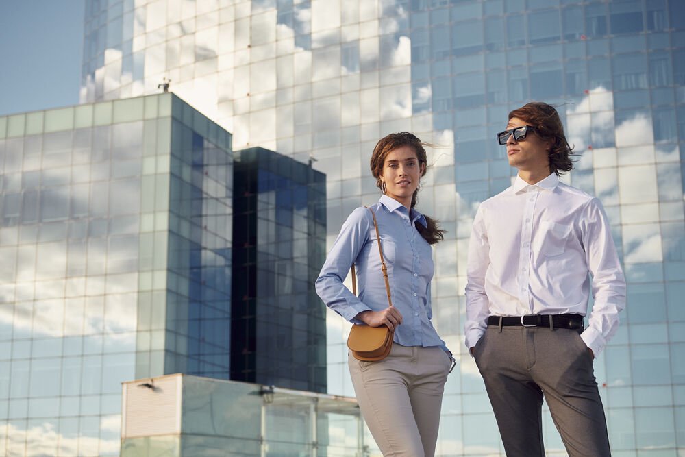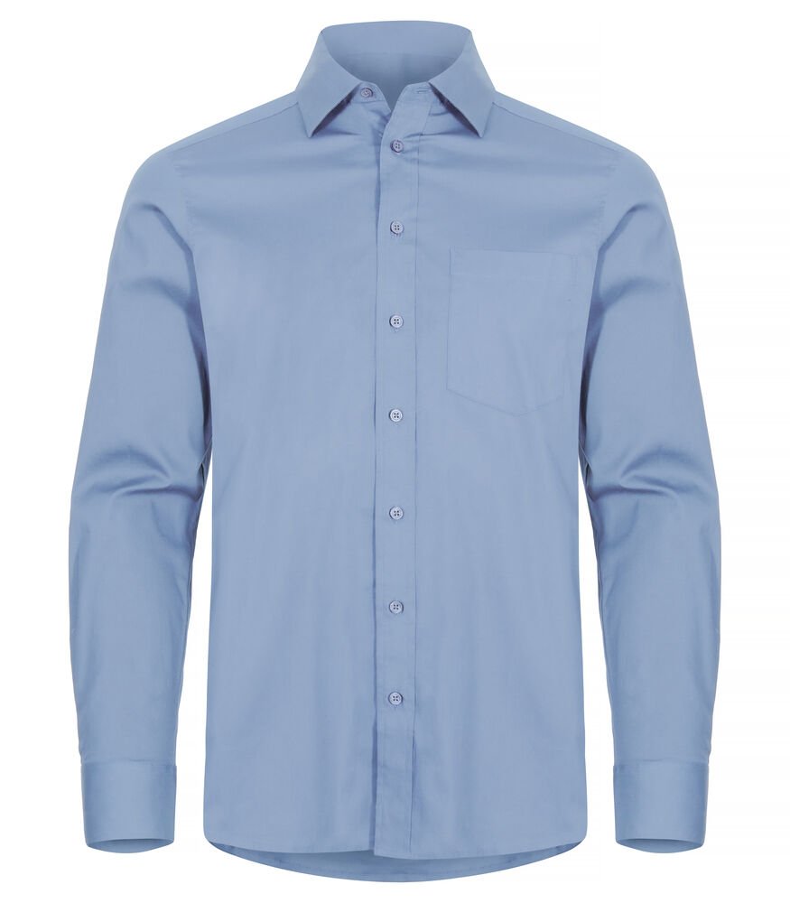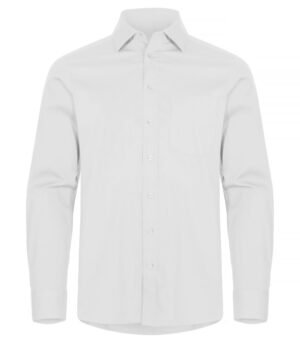 Een regular fit overhemd met een knoopsluiting en lange mouwen. De mouwen zijn te verstellen bij de knoopsluiting. Voorzien van een schouderpas aan de achterzijde. Het herenmodel heeft een borstzak, het damesmodel coupenaden.